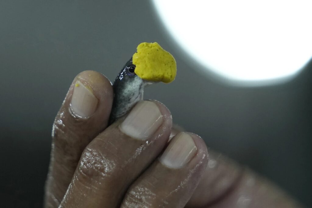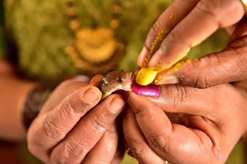 On a day chosen by astrological calculations, participants purchase a live fish from a government stall on-site for around 40 rupees (about 50 cents). The fish is then taken to an attendant working with the Bathini family, who stuffs its mouth with a yellow herbal paste before helping the participant swallow it whole. It is believed that the fish travels down the throat, clearing phlegm and congestion.